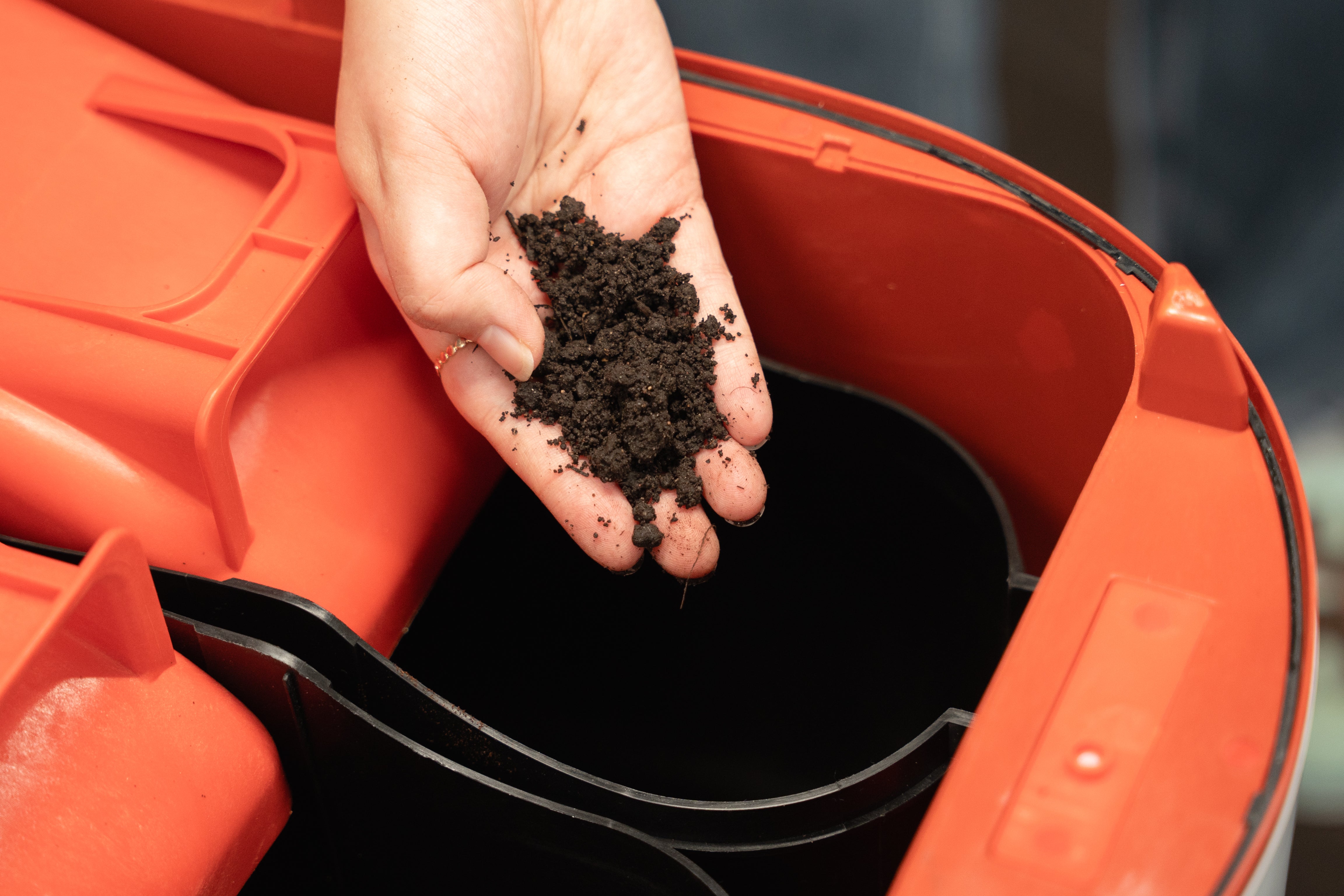 Veggie scraps, coffee grounds, eggshells, and fruit peels break down into a cohesive, soil-like output.